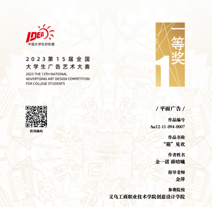 近日,2023年第十五届“全国大学生广告艺术大赛”成绩正式揭晓,创意设计学院数字媒体艺术设计专业学子在学院教师的指导下,斩获一等奖1项,三等奖1项。其中,学生金一诺,薛晗曦创作的《“箱”见欢》(指导老师:金萍)荣获平面广告类一等奖;林亚轩、杨捷、王思吏、罗博译、汤欣怡创作的《绽放她的魅力》(指导老师:金萍、陈庆)荣获视频类三等奖。