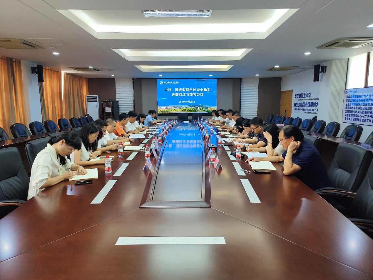 在中秋国庆“两节”即将到来之际,为维护节假日期间校园安全稳定,9月28日上午,学校召开中秋、国庆假期校园安全稳定暨廉洁过节部署会议。校领导叶斯源、徐美燕、吕华出席会议,相关职能部门及各二级学院党组织负责人参加会议。