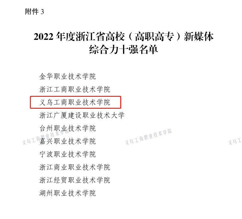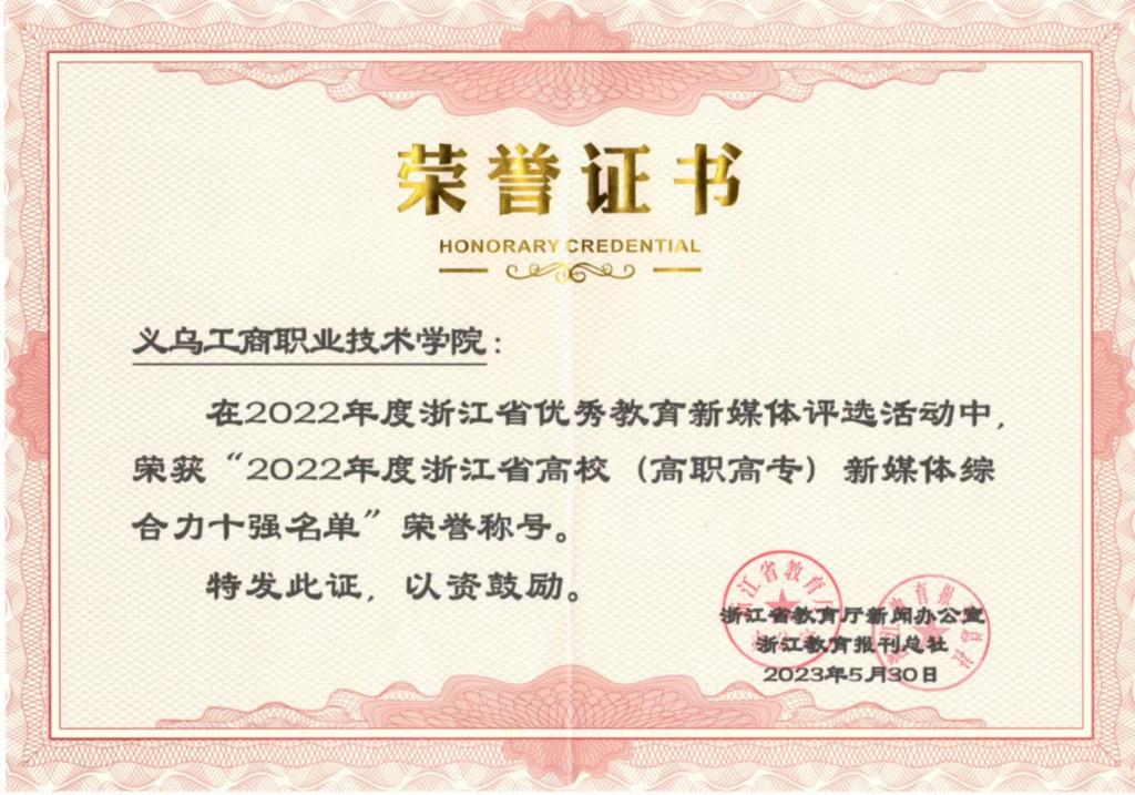 10月23日,浙江省教育厅新闻办公室、浙江教育报刊总社公布2022年度浙江省优秀教育新媒体评选活动结果,继2021年评选后,义乌工商职业技术学院再次入选浙江省高校(高职高专)新媒体综合力十强!