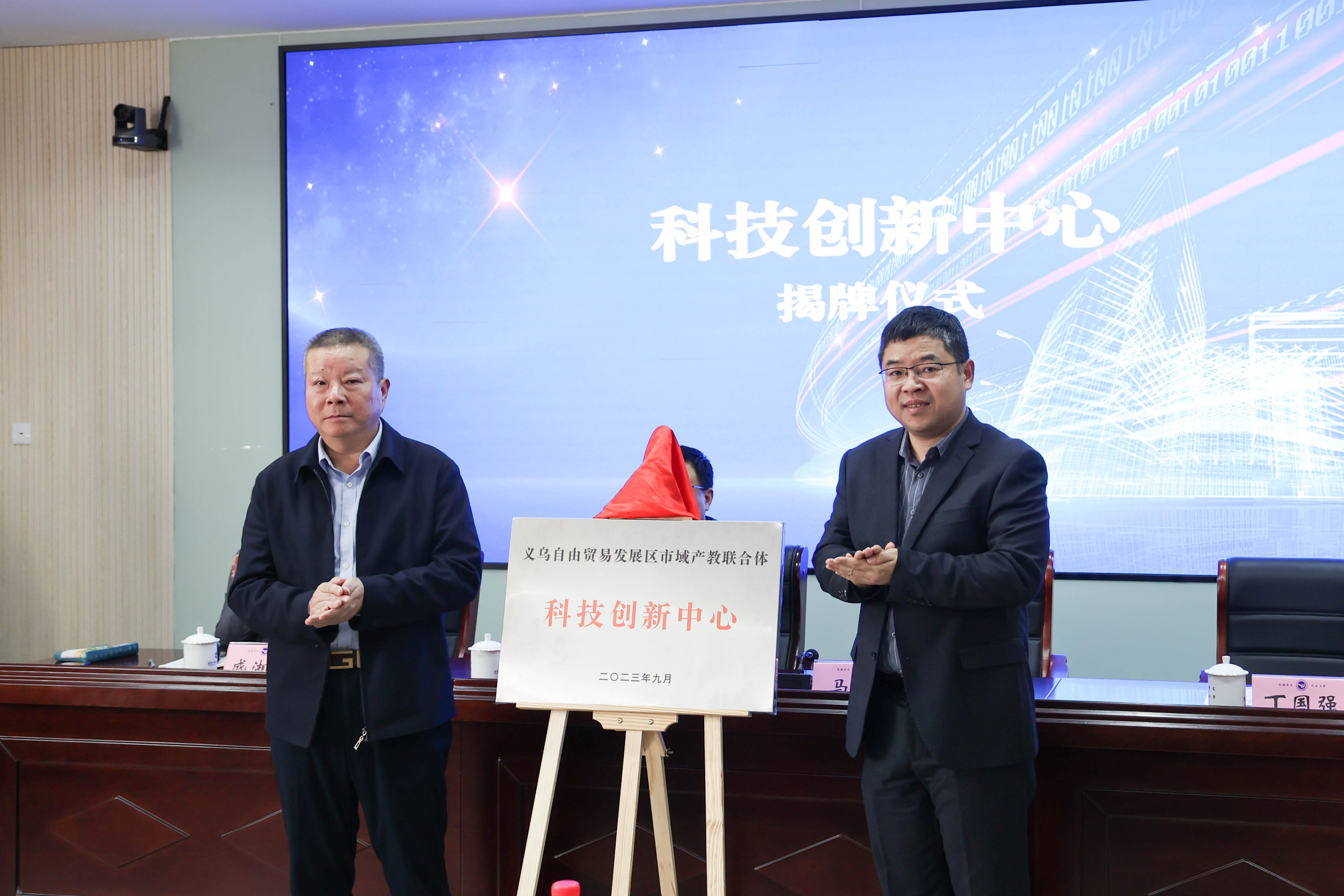 在全场的共同见证下,丁国强副局长与马广院长为学校科技创新中心揭牌。科技创新中心将进一步集汇各方资源,为区域科技创新贡献义乌工商智慧。