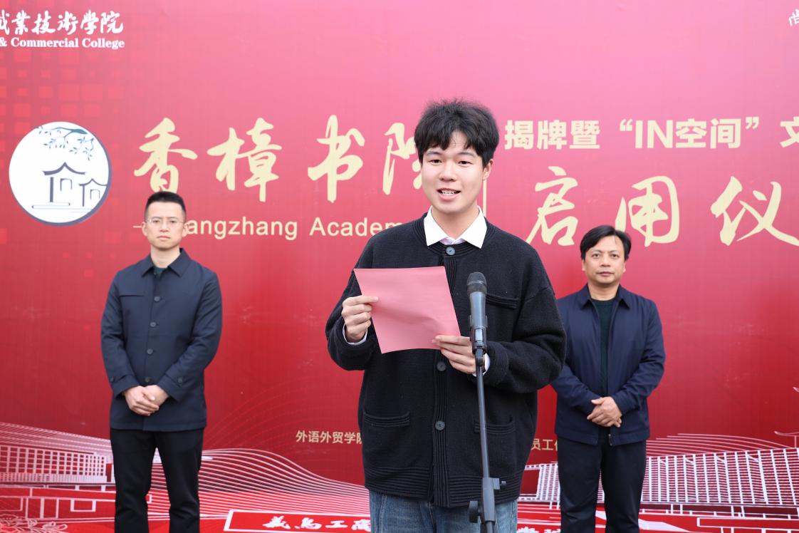 22产品艺术设计3班李浩源作为学生代表发言,他表示非常荣幸能够见证香樟书院的启用。书院丰富的生活配套设施带来了家的温馨,优美的环境带来了独特的精神愉悦。作为香樟书院的一员,他也将传扬书院精神,心存感激,努力学习,不负学校的悉心栽培。