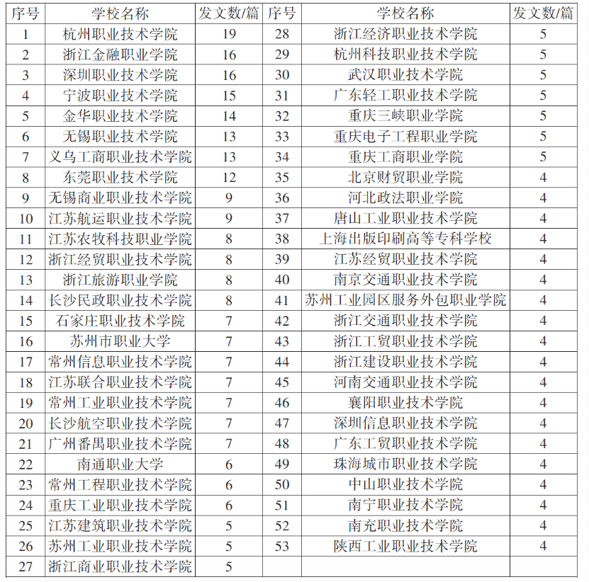 2022年公办高职高专院校发表职业教育科研论文情况(4篇及以上) 据悉本次职业教育科研论文统计范围为2022年23家教育类中文核心期刊,即《职教论坛》(南昌)、《中国职业技术教育》(北京)、《职业技术教育》(长春)、《教育与职业》(北京)4家被《中文核心期刊要目总览》(2020年版)收录的职业教育类中文期刊及19家教育类中文核心期刊。 近年来,学校高度重视职业教育研究工作,将其作为推动学校深化改革创新、高质量发展的重要抓手,鼓励聚焦新时代重大理论实践问题、职业教育改革等前沿问题,结合自身工作实践开展研究,为学校高质量发展提供智力支持。《高质量现代职业教育体系建设多元协同机制构建研究》《高质量发展背景下高职院校产教融合核心能力的体系构建、评价与提升研究》等先后获教育部人文社科课题、全国教育科学规划年度课题立项。本次刊发的13篇论文聚焦“大思政”格局、双高计划、提质培优、共同富裕、职教高考等关键词,体现了学校教师较高的科研学术水平,为职业教育科研贡献了“义乌工商”智慧。