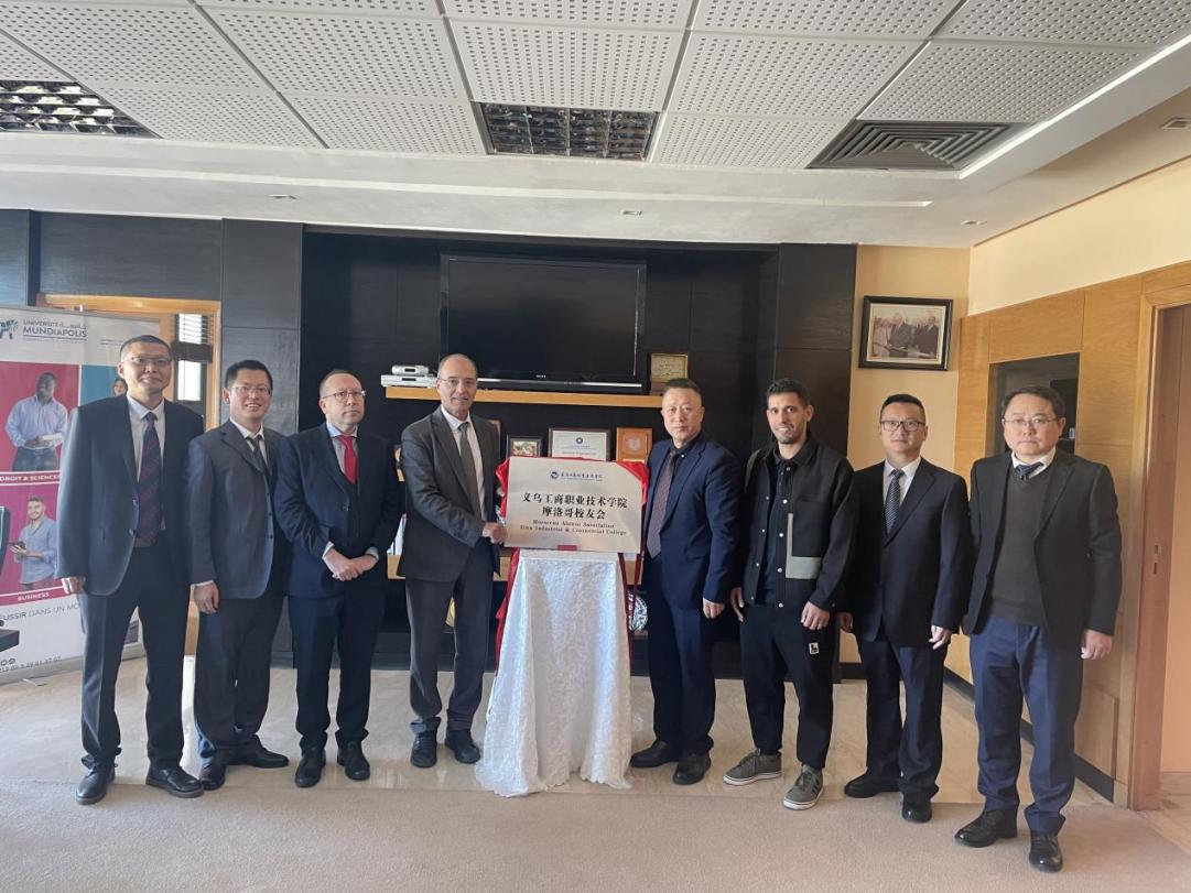 在摩洛哥蒙迪亚波利斯大学还举行了“义乌工商职业技术学院摩洛哥校友会”授牌仪式,樊曜和摩洛哥蒙迪亚波利斯大学校长穆罕默德·巴尔卡维共同为摩洛哥校友会授牌,学校2020届摩洛哥校友代表努尔曼参加授牌仪式。