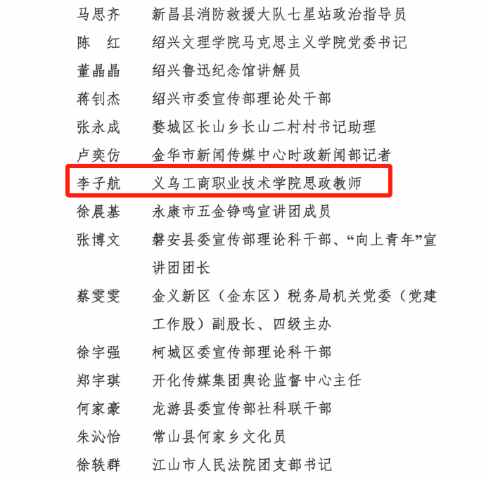 李子航老师现为“党的二十大精神”浙江青年宣讲团成员、金华市“婺江潮声”理论宣讲团成员、金华市社科理论专家宣讲团成员、义乌市“望道行”理论宣讲名师工作室成员。曾获得浙江省高校思政微课大赛特等奖、金华市教育系统微党课大赛二等奖等奖项。在党的二十大胜利召开之际,第一时间参与省委宣传部“二十大精神 浙江青年说”线上微党课录制,覆盖受众20余万人次。今年10月,受省委宣传部邀请参加“八八战略”实施20周年主题宣传展示,以“一米商铺的变迁”为线索,讲述义乌发展经验背后的成功“密码”,获得现场观看的多省宣讲工作负责人及宣讲员的大力称赞。