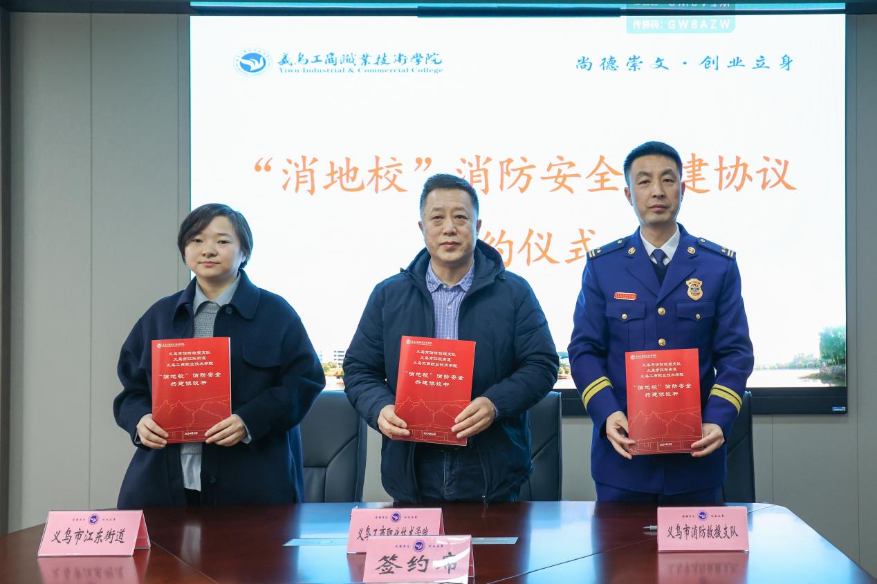 在全场的共同见证下,义乌市消防救援支队政治委员唐继文,江东街道党工委副书记、办事处主任傅凤丽和樊曜副院长共同签订“消地校”消防安全共建协议书。