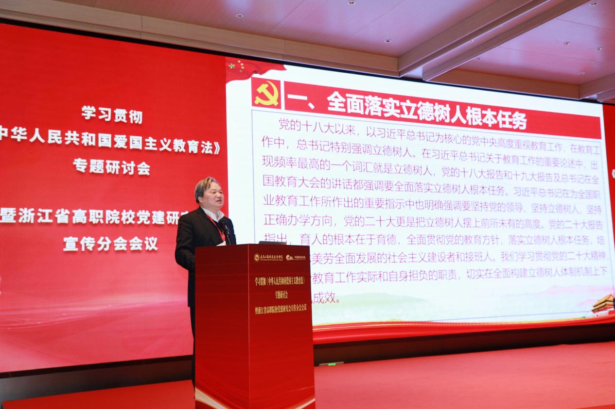 浙江省高职院校党建研究会会长、浙江金融职业学院原党委书记周建松作题为《立德树人根本任务与加强爱国主义教育》的主旨报告。