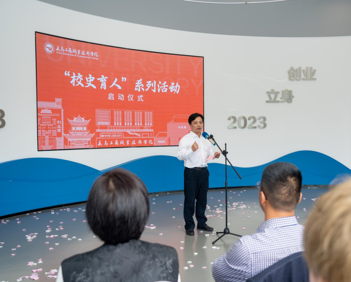 仪式伊始,一曲悠扬的古筝声响起,伴随着翩跹的舞蹈,学生社团献上精彩的文化展演,为现场增添了浓厚的春日氛围。党委副书记叶斯源发表致辞,他回顾了学校的发展历程,并着重强调了“校史育人”系列活动的深远意义。他指出,校史馆是承载着深厚文化底蕴和教育使命的重要场所,要深入挖掘校史资源,与思政教育紧密结合,致力打造“校史育人”这项思政育人品牌和载体:一是要加强校地协同,整合优质资源,发挥实践教学基地作用,打造具有义乌特色的“大思政课”建设格局;二是要聚焦主攻方向,深化对思政教育一体化建设规律的研究,打造思政育人品牌;三是要提高政治站位,加强党的领导,推动理念、方法、载体创新,培养具有家国情怀的新时代青年。