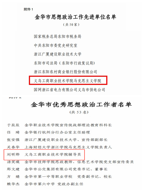 近日,金华市思想政治工作研究会公布了《uedbet,uedbet体育通报表扬金华市思想政治工作先进单位和优秀工作者的决定》,uedbet,uedbet体育马克思主义学院获评金华市思想政治工作先进单位,uedbet,uedbet体育辅导员教师刘昕烨荣获金华市优秀思想政治工作者。