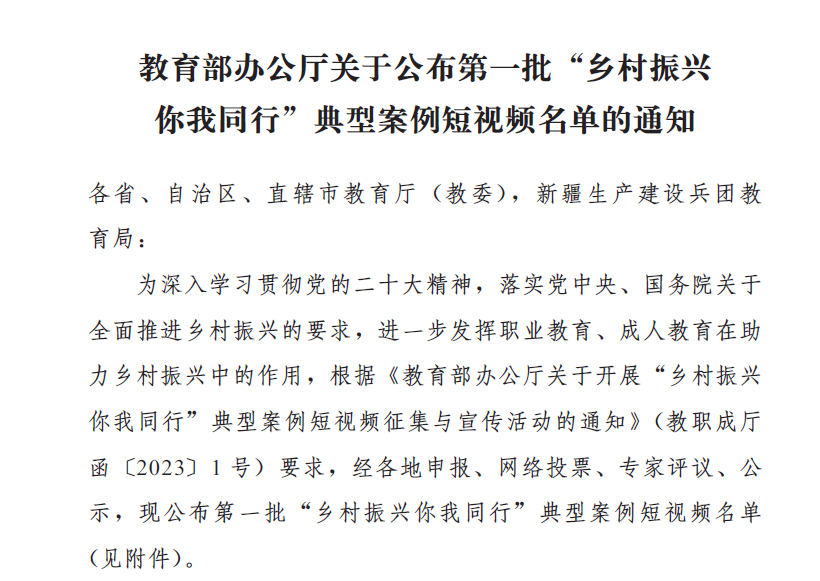 近日,教育部办公厅公布了第一批“乡村振兴你我同行”典型案例短视频名单,学校《青年兴乡村、青春创未来》成功入选。