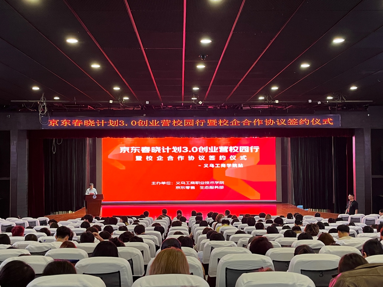 4月16日,义乌工商职业技术学院联合国内领先的综合电商平台——京东,共同举行“春晓计划3.0创业营校园行”开营仪式。义乌工商职业技术学院作为华东地区首站,正式开营!义乌工商职业技术学院党委委员、副院长徐美燕,京东零售华东产业带招商服务部浙江区域经理邵凯杰,京东合作企业义乌市众投科技有限公司董事长周增明以及义乌工商职业技术学院师生及京东集团企业代表250余人参加。