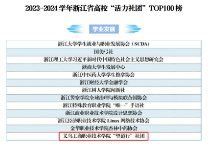 近日,在共青团浙江省委学校部、浙江省学生联合会开展的2023-2024学年高校“活力社团”风采展示活动中,学校“望道行”社团成功入选浙江省高校“活力社团”TOP100榜单。