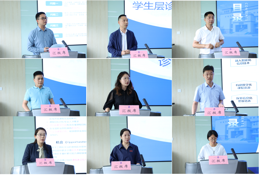 会议分为两个议程,第一个议程为集中汇报会。人事处、学生处、网络信息中心就各自层面诊断与改进工作开展情况进行汇报。专业、课程、教师、学生层面抽取6位汇报人,围绕诊改基础、两链打造、诊改运行、诊改成效、问题展望五个方面展开汇报。
