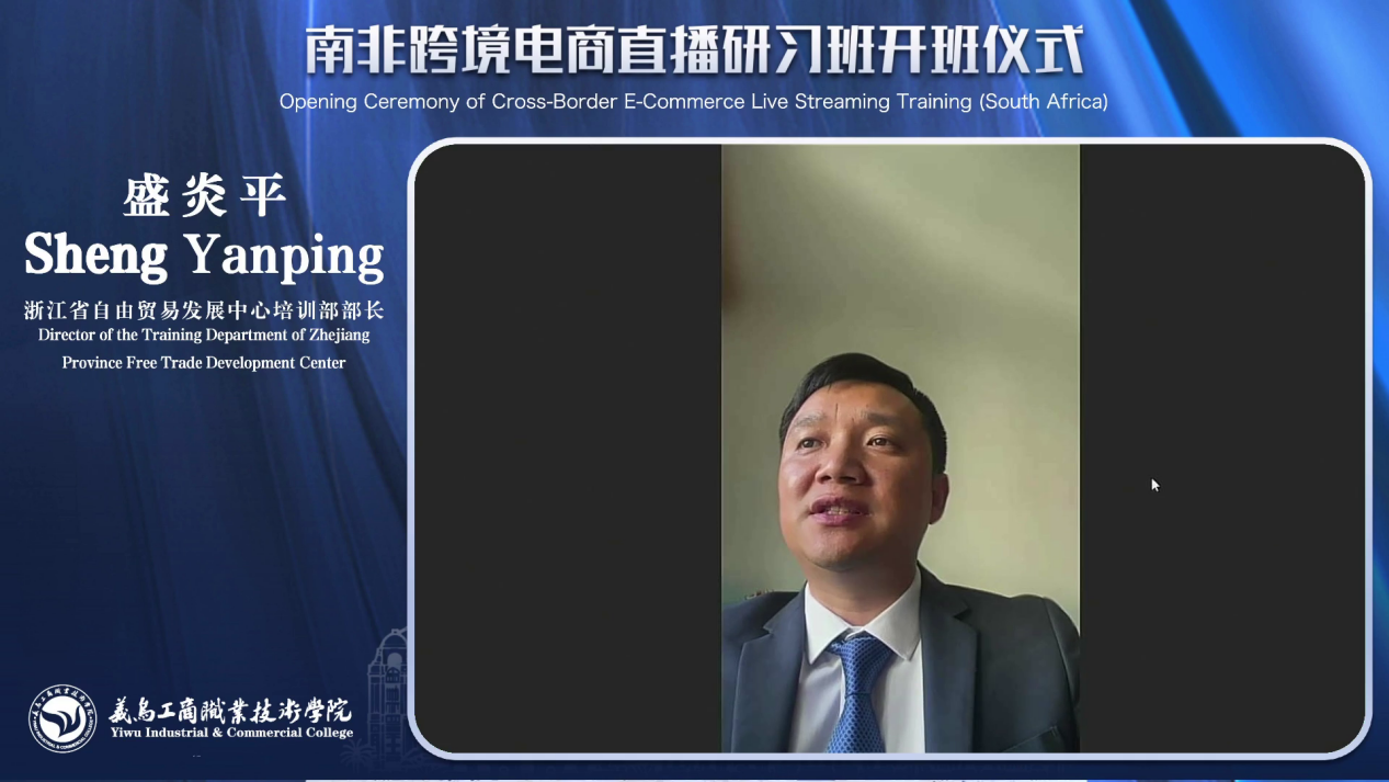 盛炎平代表浙江省自由贸易发展中心在南非跨境电商直播研习班开班仪式上致辞。他首先欢迎了来自南非的学员们,并介绍了浙江的改革开放成就和电商发展的繁荣景象。他表示,浙江作为改革开放的先行地,一直致力于推动中非电商合作,希望通过此次培训,能够促进中非经济交流,共同构建人类命运共同体。