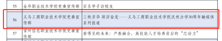 6月18日,中华出版促进会教育新闻出版专委公布2023年度教育融媒体典型案例作品、案例项目入选名单,学校上报的《三秩芳华 踔厉奋发——义乌工商职业技术学院庆祝办学30周年融媒体系列报道》入选2023年度教育融媒体典型案例。