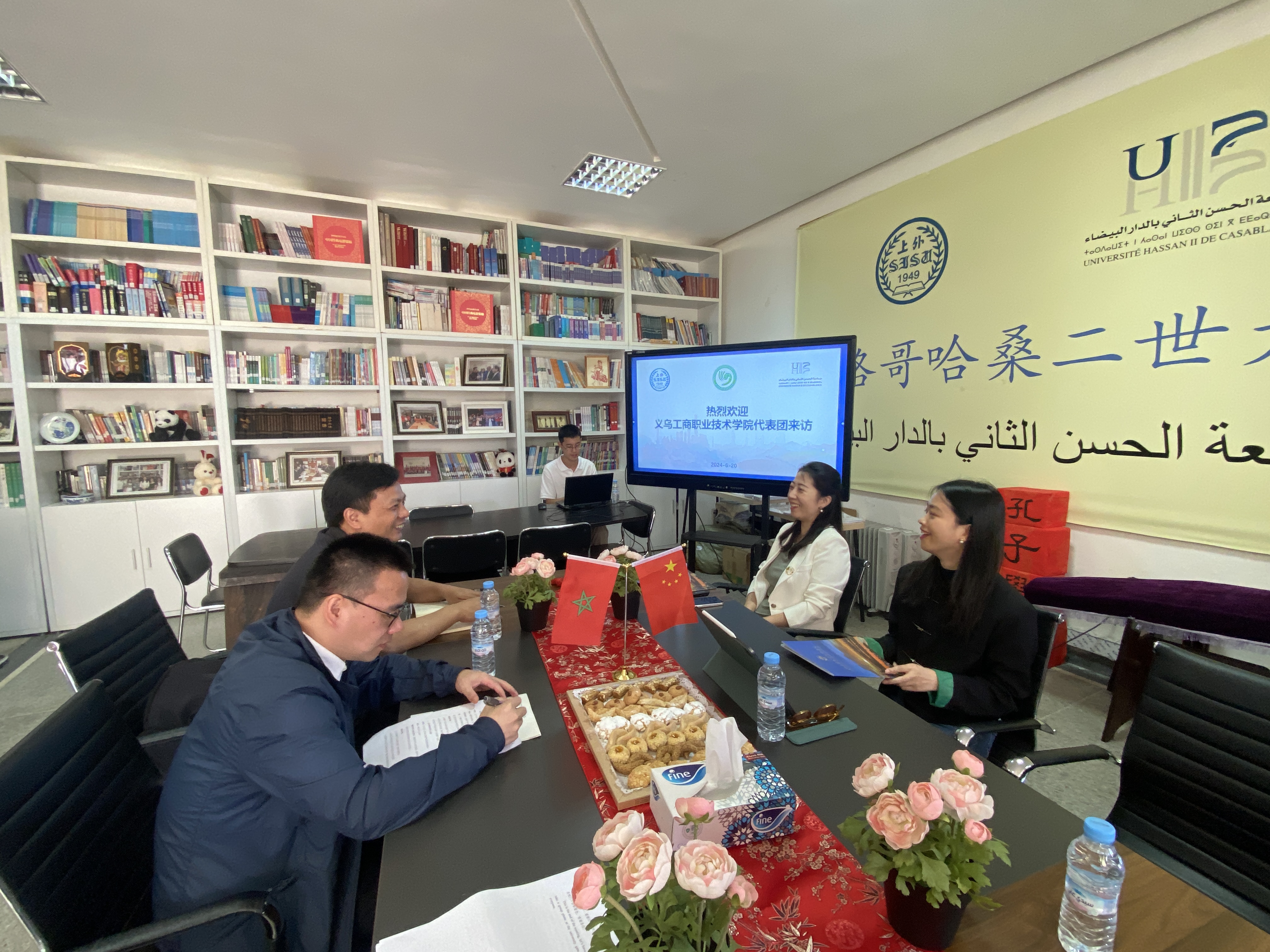 在哈桑二世大学孔子学院,访问团与哈桑二世孔子学院中方院长郑琼交流了海外办学、对外汉语教学、文化交流、摩洛哥青年升学等工作,在提高摩洛哥学生中文水平、开展“中文+职业技能”培训和文化活动、联合举办国际会议或论坛等方面达成合作意向。