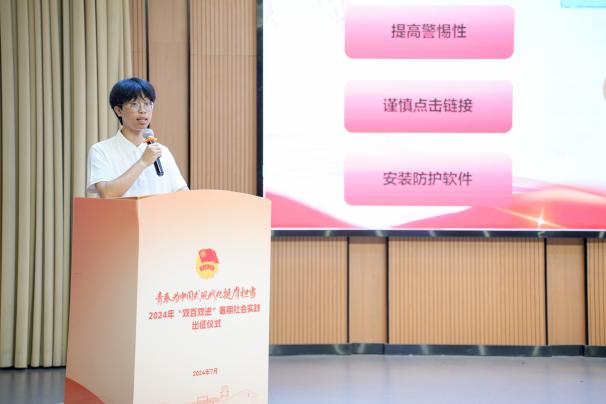 出征仪式上,校团委负责人介绍了2024年校“双百双进”暑期社会实践活动组织筹备情况。校暑期社会实践团队代表余飒同学宣读暑期社会实践倡议书。她呼吁各实践团队珍惜此次社会实践机会,紧绷安全之弦。在实践中奉献青春力量,践行青春使命,彰显青春风采。学生处负责人、宣传部负责人为西部计划志愿者王小明同学佩戴绶带并赠送纪念品。王小明表示,能够成为西部计划志愿者是一件光荣的事情,感谢母校的培养与信任,在未来的日子里,自己将用实际行动践行义工商青年的使命担当。