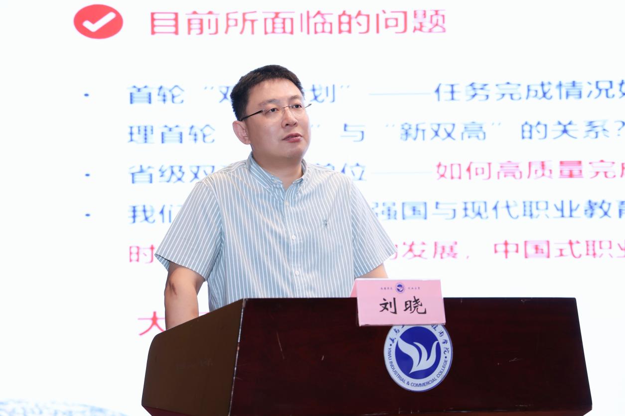 刘晓教授作题为《抓机遇谋发展寻突破——对“新双高”产教融合工作的展望与思考》的专题报告。报告从“新双高”建设所面临的问题切入,从“职业教育改革的‘顶层设计’”“高等职业教育发展的时代内涵”“职业教育的历史使命”“‘新双高’的展望和思考”四个方面,论述了产教融合在职业教育中的核心地位和作用,深入探讨了职业教育与区域产业发展同频共振的内涵与路径。