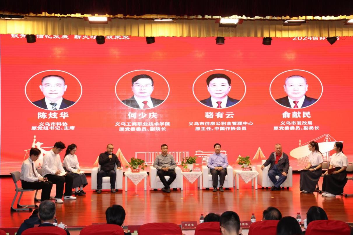 为学习贯彻党的二十届三中全会精神,庆祝中华人民共和国成立75周年,发挥“五老”群体的引领之力,推进大中小学思政教育一体化,引导大中小学生深入了解“八八战略”的丰富内涵和“义乌发展经验”的时代价值,10月11日,“银青共话忆发展 薪火相传筑未来”2024年信仰对话活动在学校丹溪文化厅举行。金华市关工委常务副主任邱建中,金华市教育工委专职副书记、市教育局党组副书记陈群,金华市关工委专职副主任金闪闪,义乌市委常委、组织部部长何军杰,义乌市关工委主任吴伟兴,义乌市委组织部常务副部长、老干部局局长程亮,义乌市委教育工委专职副书记、党委委员楼洪昌莅临活动。校党委书记李昌祖,校党委副书记、关工委主任叶斯源,校党委委员、组织部部长、统战部部长、离退休工作处处长彭春燕,党委委员、宣传部部长郑伟俊,校关工委常务副主任陈沛森等出席活动。活动邀请义乌市教育局、义乌市中小学代表,学校职能部门负责人、二级党组织负责人,学校师生代表共计六百余人参加。