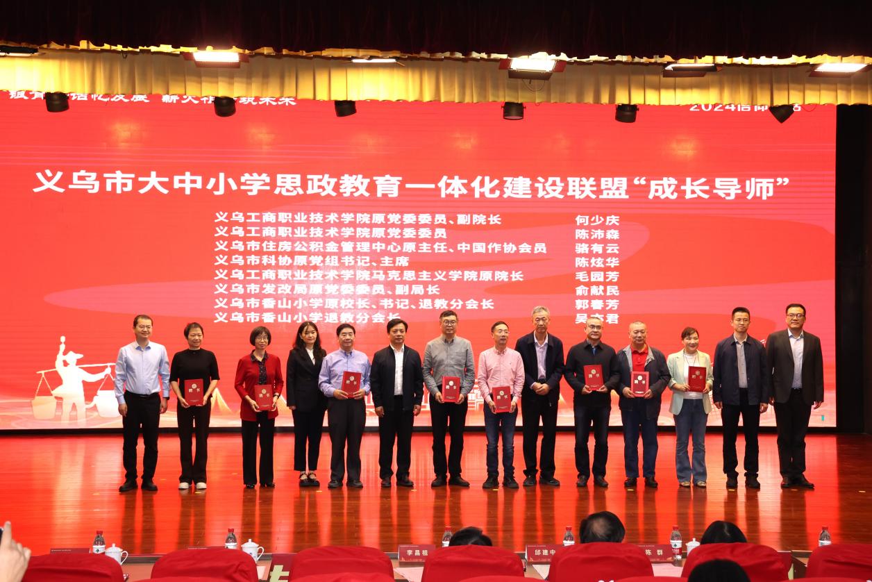 会议还举行了“大中小学思政教育一体化”师资聘书颁发仪式。叶斯源、吴伟兴、彭春燕、郑伟俊等领导为出席的老干部、老教师颁发义乌市大中小学思政教育一体化建设联盟“成长导师”聘书。