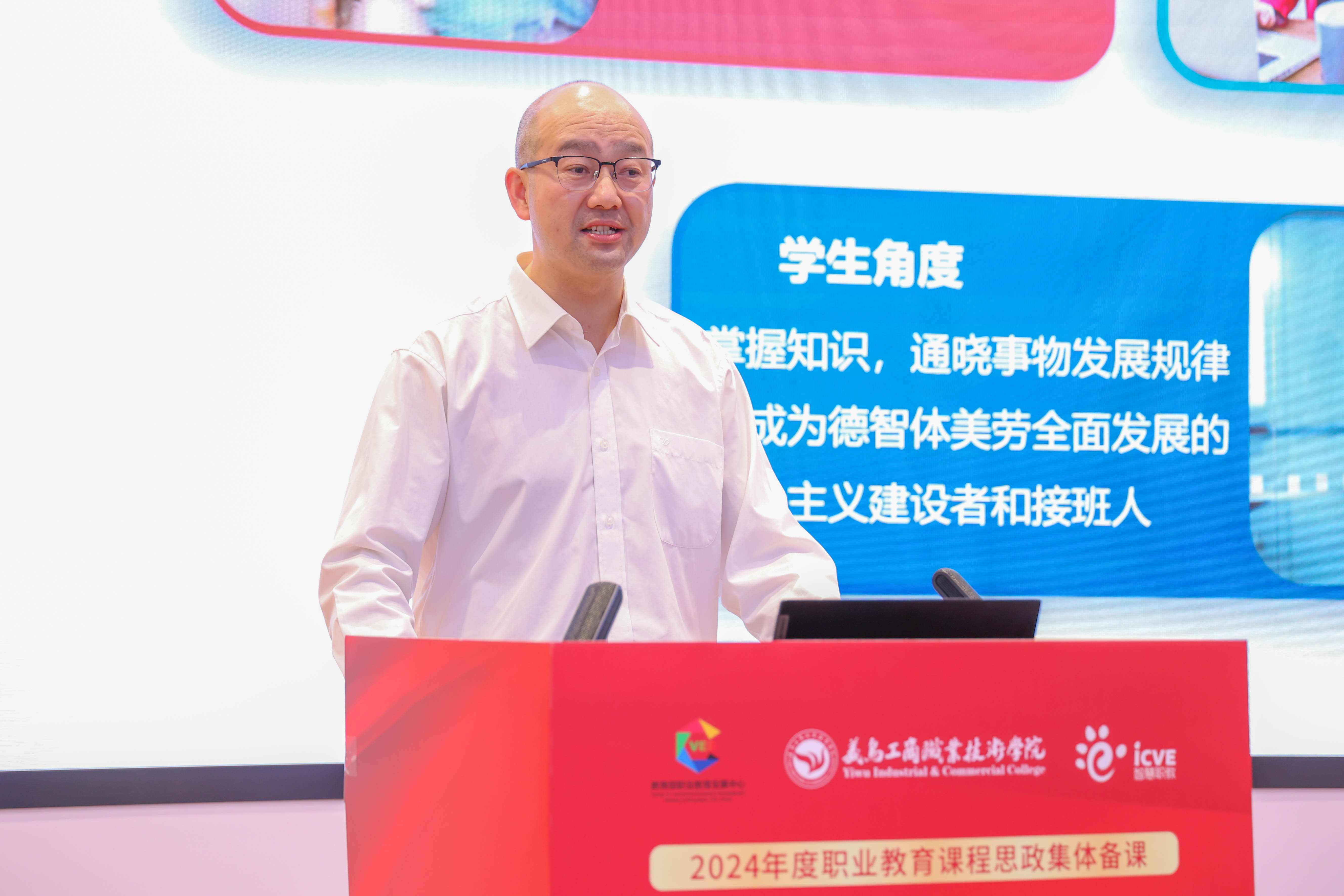备课会开场式环节,教育部职业教育发展中心副主任黄辉发表讲话、义乌工商职业技术学院院长马广致辞。黄辉表示,推进课程思政是落实立德树人根本任务的重要途径,组织开展职业教育课程思政集体备课活动,是加强职业教育课程思政建设的重要举措,是提升思想政治教育质量的关键一环。希望大家将这次课程思政集体备课活动与学习贯彻全国教育大会精神结合起来,不断提高政治站位,不断提高育人能力,共同为推进职业教育高质量发展,建设教育强国贡献智慧和力量。