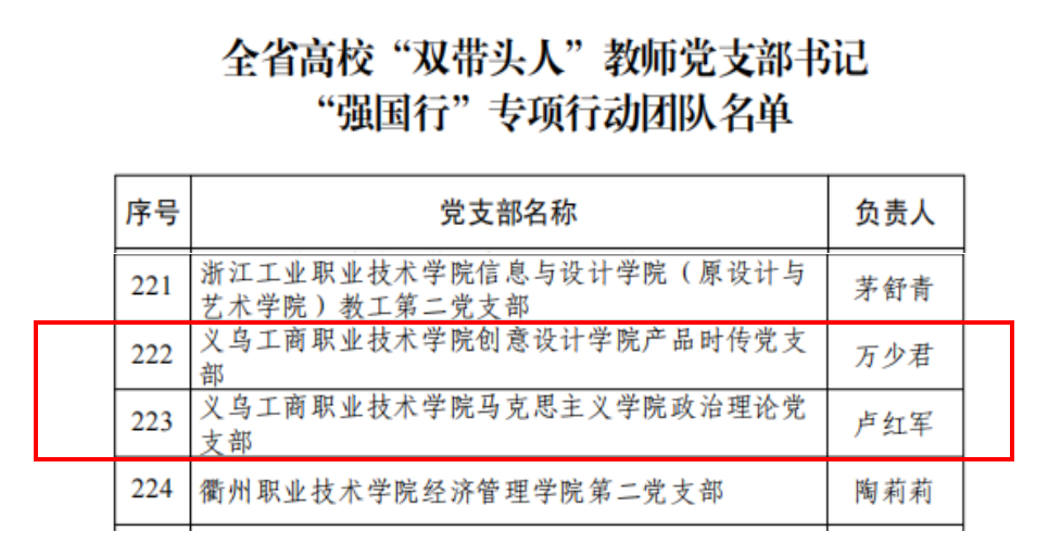 11月7日,中共浙江省委教育工作委员会办公室印发《uedbet,uedbet体育公布全省高校“双带头人”教师党支部书记“强国行”专项行动团队名单的通知》,创意设计学院产品时传党支部、马克思主义学院政治理论党支部成功入选。这是继今年9月外语外贸学院国贸党支部入选全国高校“双带头人”教师党支部书记“强国行”专项行动团队以来,取得的又一新成果。