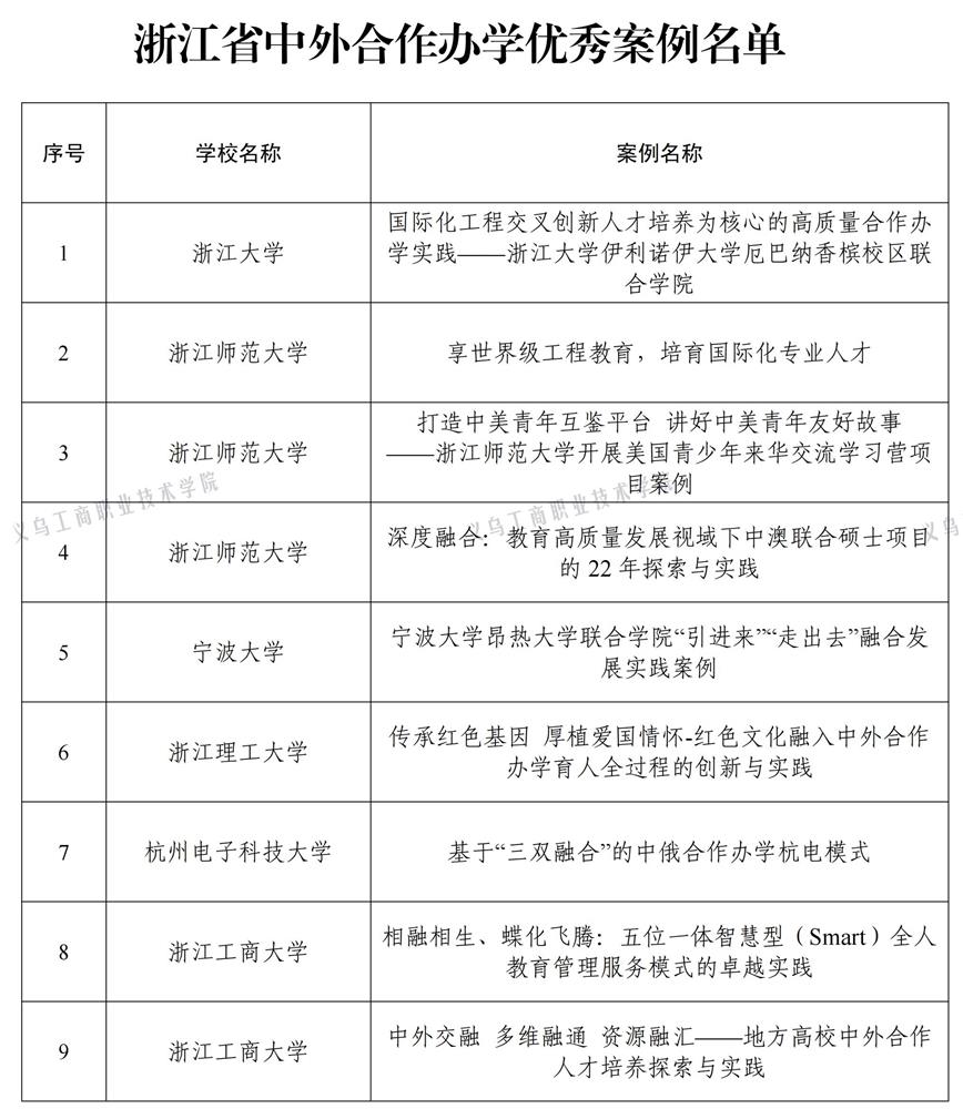 近日,省教育厅开展的中外合作办学优秀案例征集结果揭晓,uedbet,uedbet体育《打造合作办学“三互”模式 强化产城教协同育人——义乌职教创新推进中外合作办学国际化人才培养》及《数字赋能“产学研用”四位一体 小商品国际化设计专才培养》两个案例成功入选。