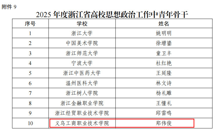 郑伟俊专注于宣传思想文化和思想政治工作研究和实践,深入学习宣传贯彻习近平文化思想,以“义乌发展经验”为根本遵循,以高职教育发展规律为主线,以信仰之源为首要思政元素,聚焦思政育人主阵地,构建“1555+N”“大思政课”建设体系,高标准培育打造具有义乌味、大学味、创业味、实践味的“真理的味道”“大思政课”品牌。传承“真理之味”,实施“四聚焦、四个一”行动,积极开展大中小学思想政治教育一体化建设与研究,带领团队入选2024年浙江省大中小学思政课教师一体化示范团队、品牌建设优秀案例和示范“金课”。传扬“丝路之风”,立足学校办学特色,将义乌敢闯敢创、改革创新的精神与学校“创”文化深度融合 ,积极投身“义起筑梦”理论宣讲实践,引领青年学子追寻真理之光、助力青年学生成长成才。