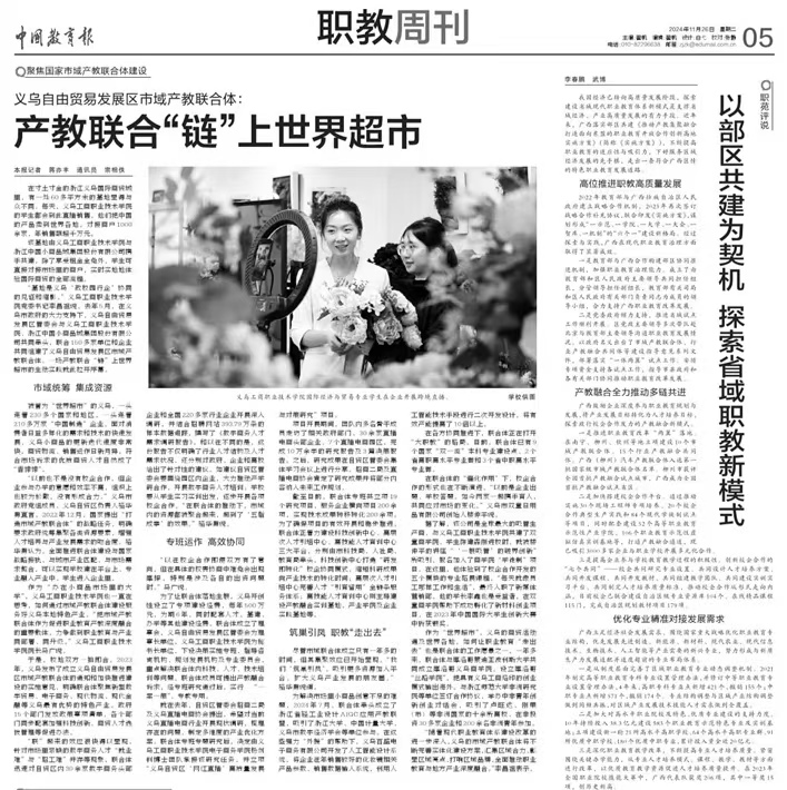 学校深入推进校企合作、产教融合,联合150多家单位共建义乌自由贸易发展区市域产教联合体,入选国家第二批市域产教联合体名单(全国仅6家)。牵头成立的全国数字商务行业产教融合共同体入选首批省级行业产教融合共同体名单;牵头成立全国国际贸易行业产教融合共同体,建成省级职业教育校企合作典型生产实践项目1项、开放型区域产教融合实践中心,入选金平果评价网第二批“产教融合100强”名单;主动融入区域发展大局,新增中高职一体化五年制合作专业4个,累计培训37.5万人.天。获全国首批来华留学生高等职业教育质量认证6年有效期,摩洛哥义乌丝路学院获评浙江省第三批“一带一路‘丝路学院’”,再次荣登浙江省高职高专院校国际化总体水平排行榜第二名。