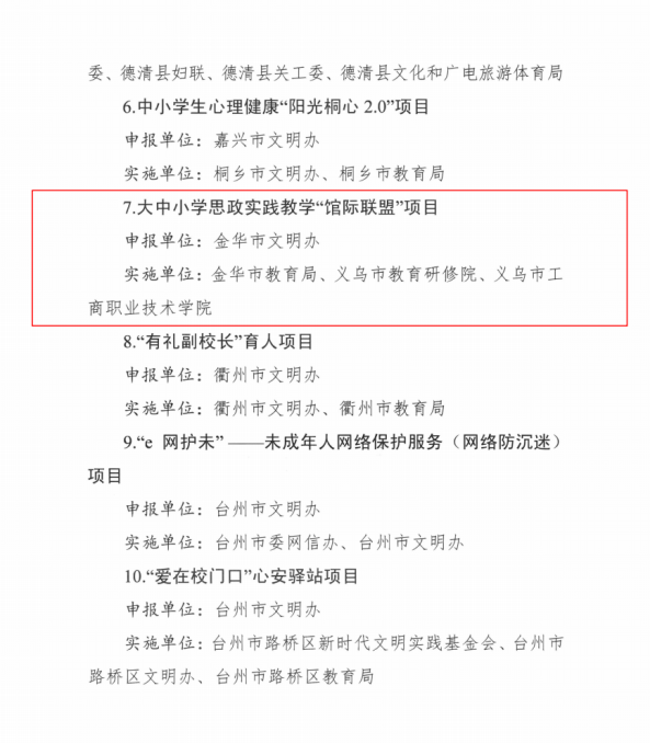 近日,浙江省精神文明建设办公室公布“2025年全省未成年人思想道德建设十件实事”评选结果,由金华市文明办申报,金华市教育局、义乌市教育研修院、义乌工商职业技术学院联合实施的大中小学思政实践教学“馆际联盟”项目成功入选,其中uedbet,uedbet体育是实施单位中唯一一家高校。