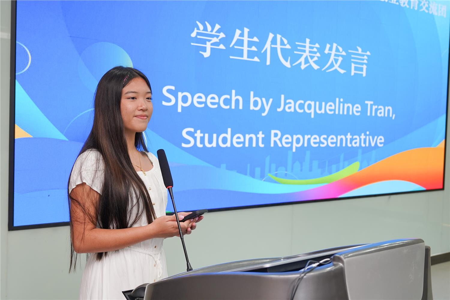 交流团青年代表杰奎琳(Jacqueline)在发言中表示,十分期待交流团的活动,她和同学们将用心感受学校和义乌特色,了解中国文化,加强与中国师生交流互动。