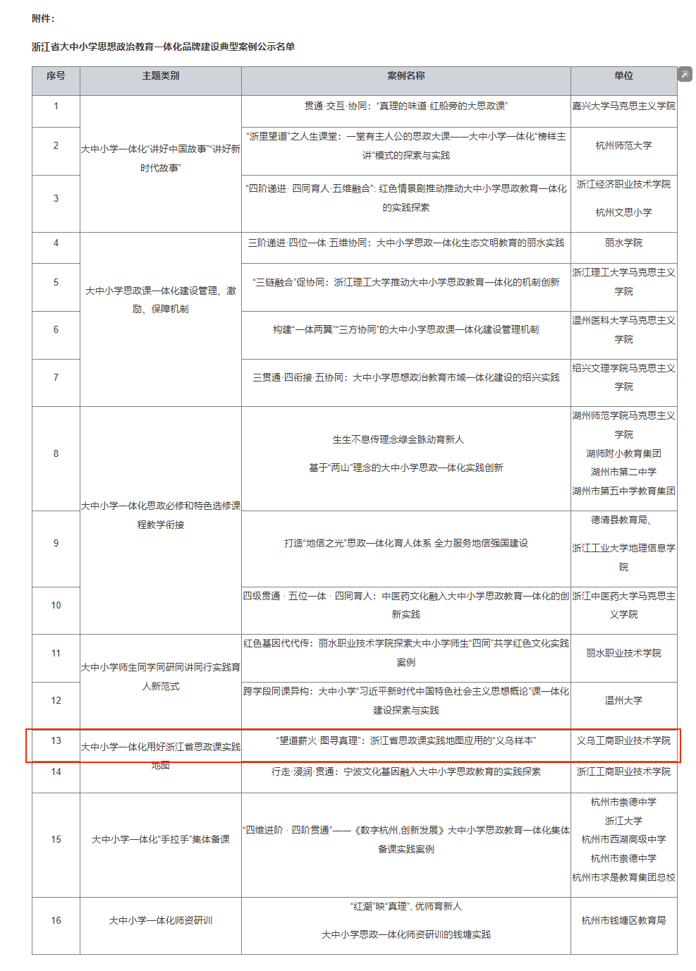 近日,义乌工商职业技术学院在“大思政课”建设领域捷报频传,品牌建设、案例评选、课程竞赛多点开花,接连斩获重要成果,充分彰显了学校在大中小学思想政治教育一体化建设中的扎实成效与引领作用。