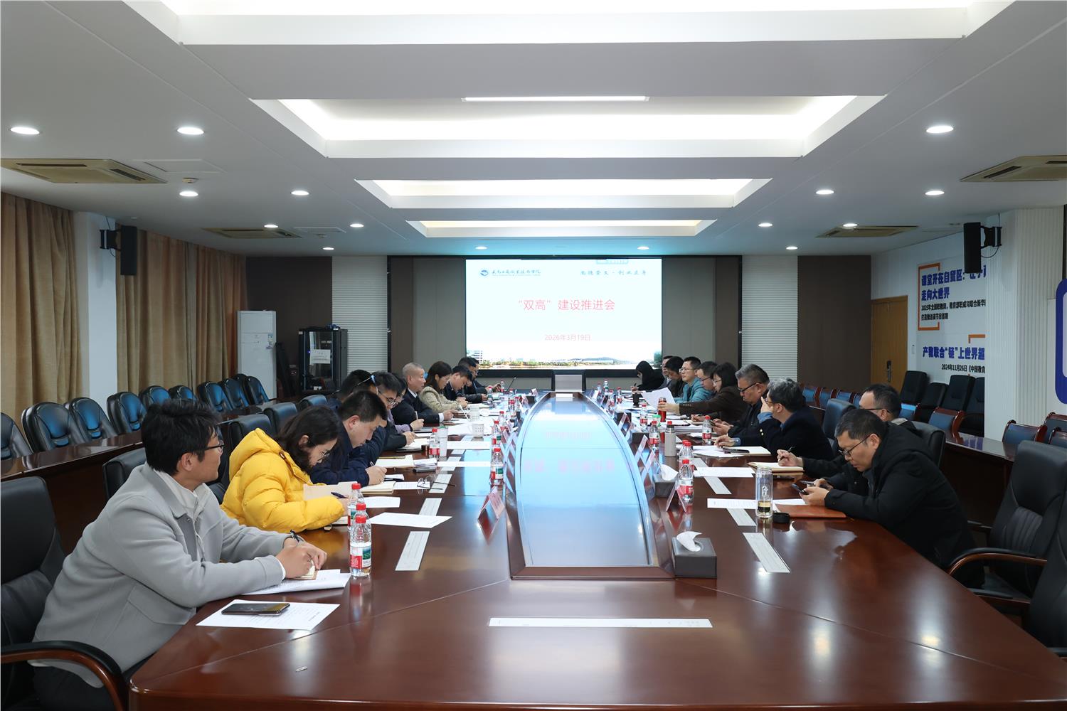 3月19日下午,学校召开“双高”建设推进会,全面部署近期双高建设工作。相关职能部门负责人,外语外贸学院、机电信息学院等相关教学单位负责人参加会议。党委书记马广、院长徐美燕出席会议并讲话,副院长盛湘君主持会议。