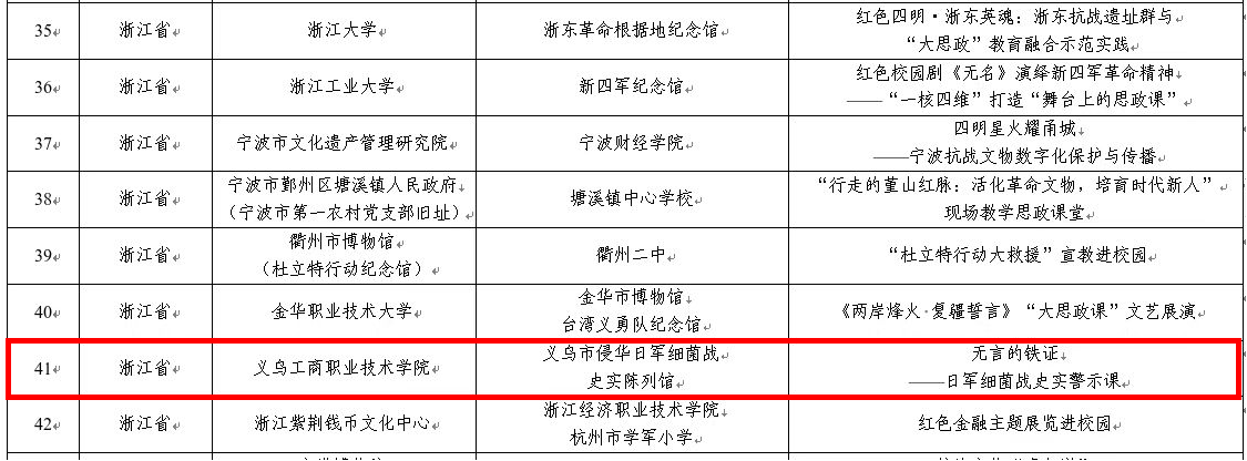 uedbet,uedbet体育入选的“无言的铁证:日军细菌战史实警示课”项目,依托义乌市侵华日军细菌战史实陈列馆丰富的馆藏资源和史实材料,通过课程资源建设、实践教学设计和协同育人机制创新,进一步拓展了“大思政课”建设载体,丰富了思政教育内容,为开展爱国主义教育、历史教育和国防教育提供了有力支撑。