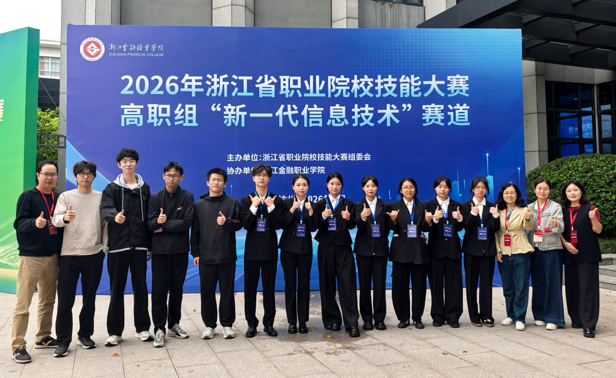 4月11日—12日,2026 年浙江省职业院校技能大赛高职组新一代信息技术赛道比赛在浙江金融职业学院圆满落幕。本次大赛汇聚全省高职院校共 58 支参赛队伍同台竞技,机电信息学院三支团队凭借扎实技能与出色发挥,在激烈角逐中脱颖而出,由李方、陈静老师指导的蒋林珍、倪嘉潞、朱思琪、吴俊毅团队荣获金奖,由陈志军、吴亘杰老师指导的郭天正、陈泓、宋润泽、沈亮团队荣获银奖,由全秋燕、王英彦老师指导的廖梦琳、苏其培、夏宇洁、范鈺喧团队荣获铜奖,以一金一银一铜的优异成绩彰显学院育人实力。