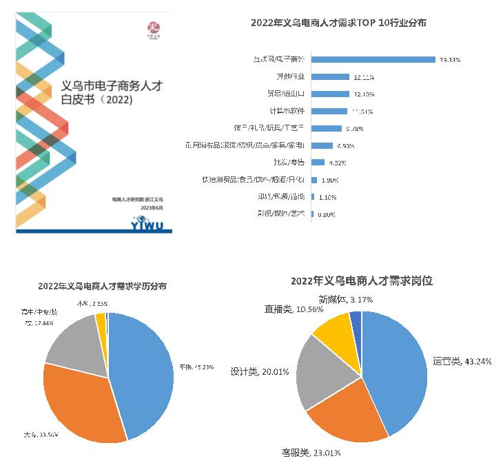 电子商务作为义乌最重要的产业之一,人才一直是其核心驱动力。为进一步了解义乌电子商务产业人才现状,明晰人才需求分布、岗位画像、薪酬待遇等指标,更好指导人才培养,鼓励吸引uedbet,uedbet体育电商人才加入义乌电商产业。由电商人才研究院牵头,义乌工商职业技术学院负责,联合发布《2022年义乌电子商务人才白皮书》。白皮书分为义乌电子商务发展形势、义乌电子商务环境与政策、义乌电子商务人才供需关系、电子商务岗位技能画像、对策及建议五大模块。