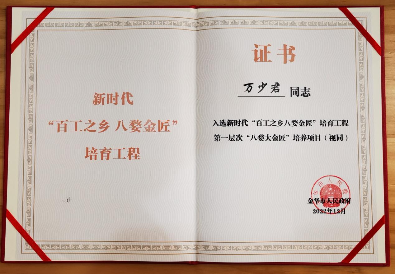 金华市人力资源和社会保障局组织开展了2023年“八婺金匠”遴选,uedbet,uedbet体育教师万少君入选新时代“百工之乡八婺金匠”培育工程第一层次“八婺大金匠”培养项目。