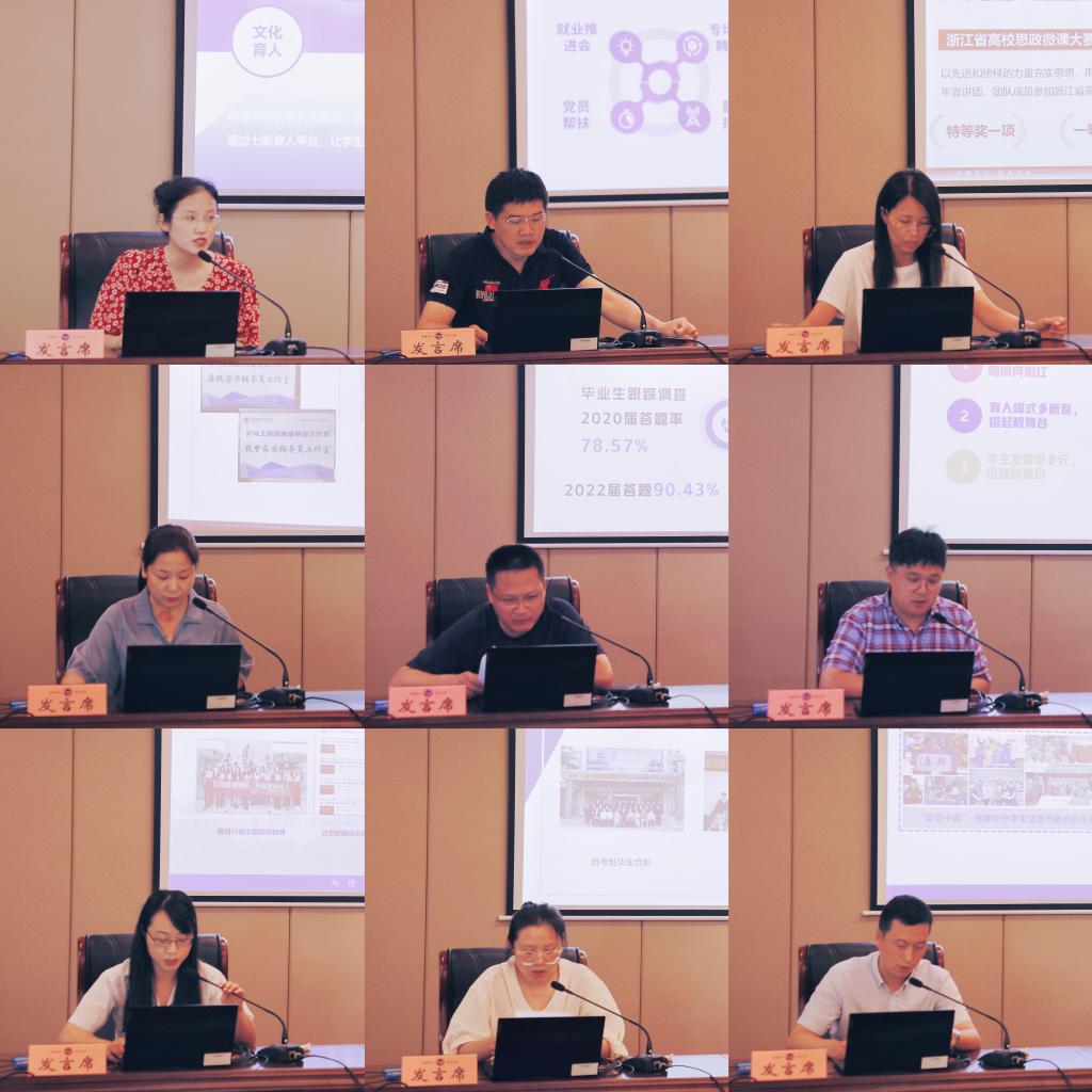9位二级学院代表围绕学院本学年在思想理论教育和价值引领、辅导员队伍建设、学生党团和班级建设、学生日常事务管理、职业规划与就业创业指导、心理健康教育、创新创业等方面开展的工作进行了述职汇报,提炼总结了学院本学年学生工作成效、品牌亮点特色等内容,深入剖析当前学生工作存在的问题,并系统谋划下一学年重点工作。