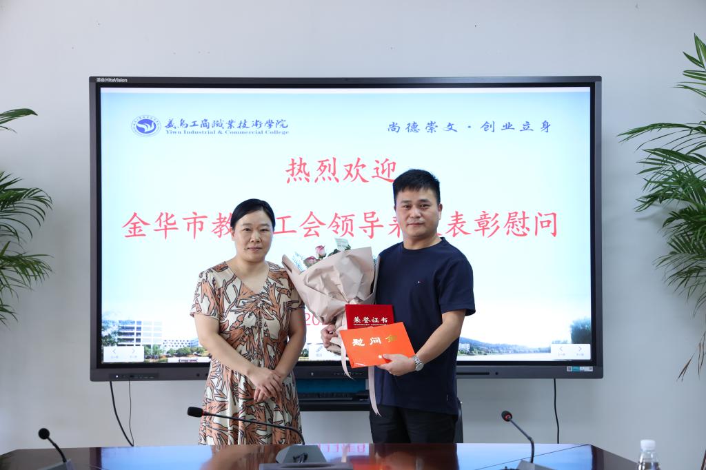 吴飞代表金华市教育工会对金华市最美教师李时辉老师,金华市师德先进个人龚江洪老师进行表彰,并送上鲜花,勉励他们要始终践行立德树人初心,涵养师德风范,淬炼育人本领,永葆教育热情,切实担负起人民教师的光荣使命。