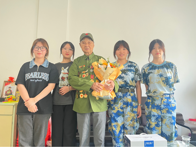 万家团圆迎中秋,四海欢腾庆国庆。在双节到来之际,为了进一步弘扬英雄精神,传承红色血脉,厚植爱国主义情怀。近日,义乌工商职业技术学院“光影敬英雄”红色精神宣讲团队的队员们延续暑期实践活动,再寻老兵足迹,探望95岁抗战老兵朱光,与抗战老兵重温红色之旅,共同溯源红色精神,感悟来时路,传承红色力量。抗战老兵与青年大学生两代人跨越时间的长河,亲切交流,真情对话。