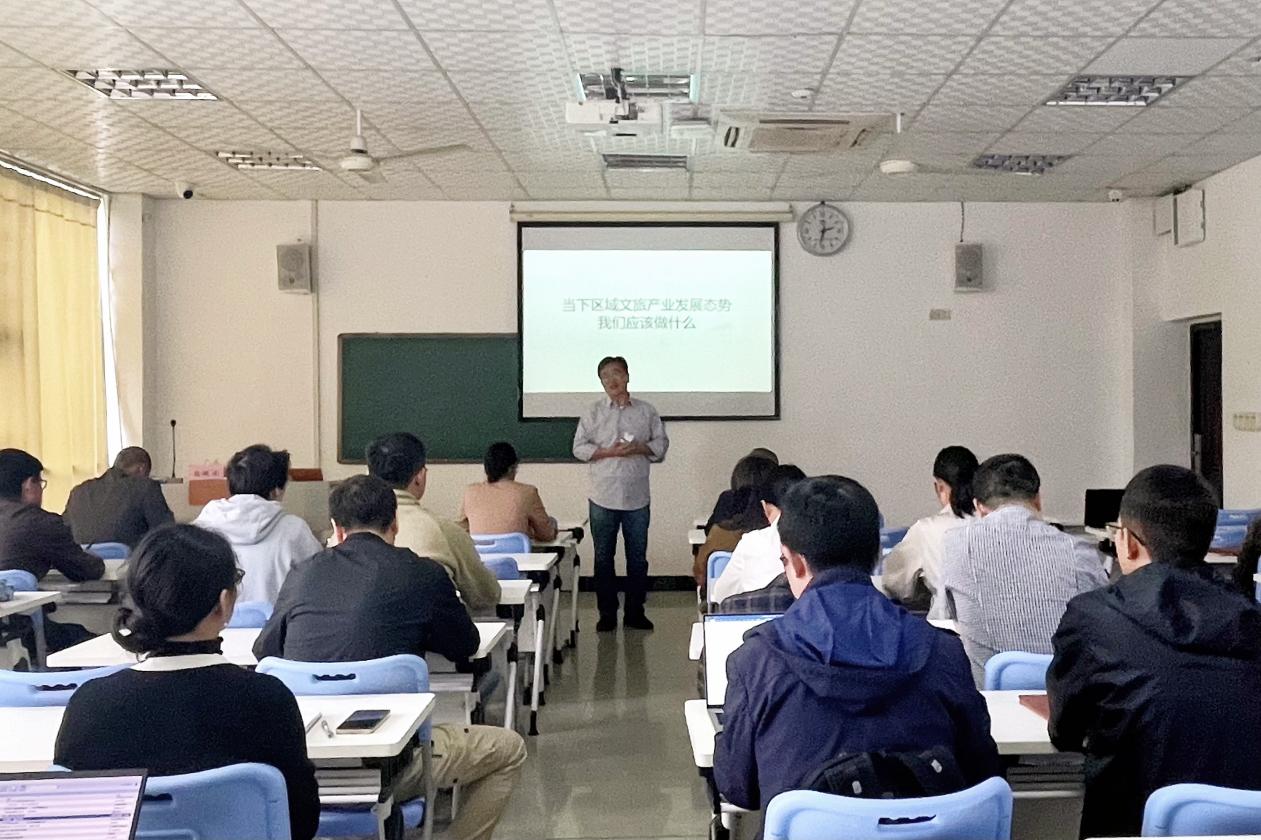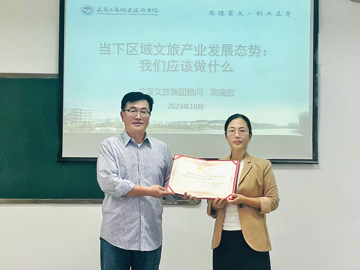 在助力人文旅游学院更好地融合文旅产业与教育的道路上,兰溪文旅集团顾问简瑞宏先生应邀来到学院,为教师们开设了一场别开生面的讲座。这次的讲座聚焦于教师如何通过课题研究与创新,更好地参与文旅产业的发展并实现创收。