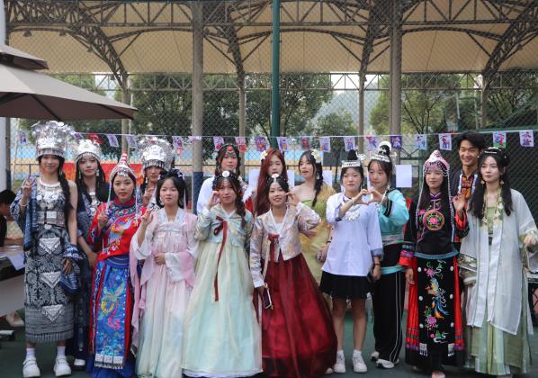 活动现场,会展专业学生为服装扮演者,身着苗族服装、侗族服装、水族服装、壮族服装、藏族服装、傣族服装、畲族服装、朝鲜族服装和汉服进行校园游走展览宣传。