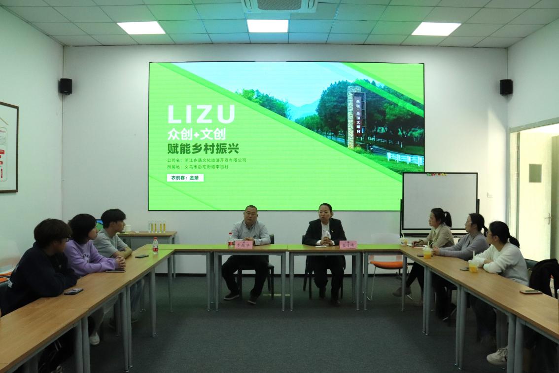 在李祖村会议室,浙江乡遇文化旅游开发公司董事长金靖为师生带来“众创+文创赋能乡村振兴”主题讲座。金董事长介绍自己姓金,名靖,字子靖,寓意有责任感,有抱负,是一名积极投身乡村振兴大浪潮的农创客。她从李祖村的项目概况、核心团队、众创理念、文创赋能、项目成效、未来展望六个方面为大家讲述了李祖村改善村居环境、发展乡村旅游、培育新产业新业态的蝶变历程,展示了一幅新时代美丽乡村新画卷。