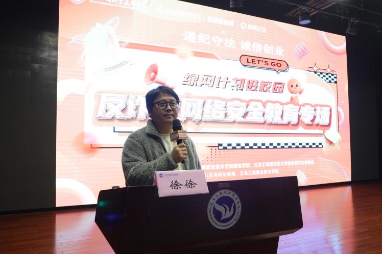 为普及网络安全知识,增强同学们的反诈、安全合规经营意识,11月27日下午,创业学院、校安处联合义乌市公安局及淘天集团安全部合规教育团队,在丹溪文化厅举办了一场“绿色计划进校园——反诈及网络安全教育”专场宣讲活动。特邀义乌市三级警官、义乌市反诈宣传大使俞骁,以及淘天集团安全部安全策略专家陈斯潮、徐徐展开主题宣讲。