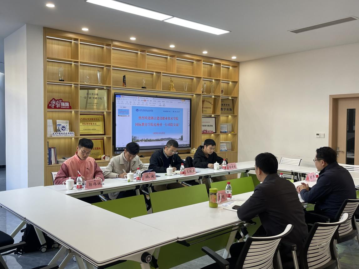 近日,浙江建设职业技术学院国际教育学院院长孔杨勇一行4人来校访问交流。国际教育学院、国际合作与交流处、国际学生管理科相关负责人等在国际创客园与来宾进行座谈交流。