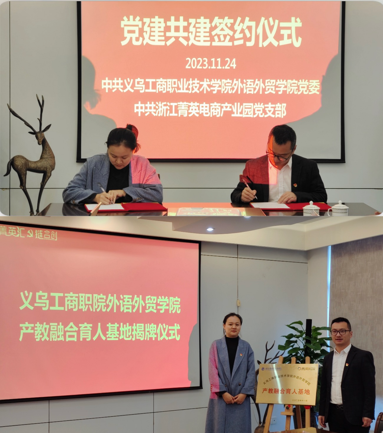 外语外贸学院党委负责人与菁英产业园党支部书记签订党建联建框架协议,并为产教融合育人基地揭牌。