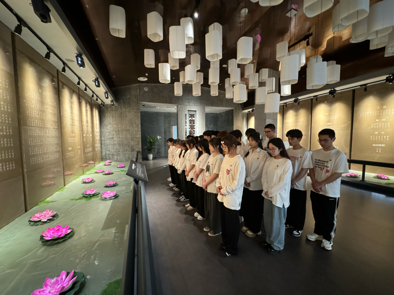 在遇难同胞纪念展厅,活动进入默哀环节。面对着铭刻在墙上的一个个遇难同胞的名字,在场的每一个人都低头肃立,为那些无辜逝去的生命默哀悼念。这一刻,时间仿佛凝固,空气中弥漫着哀伤。