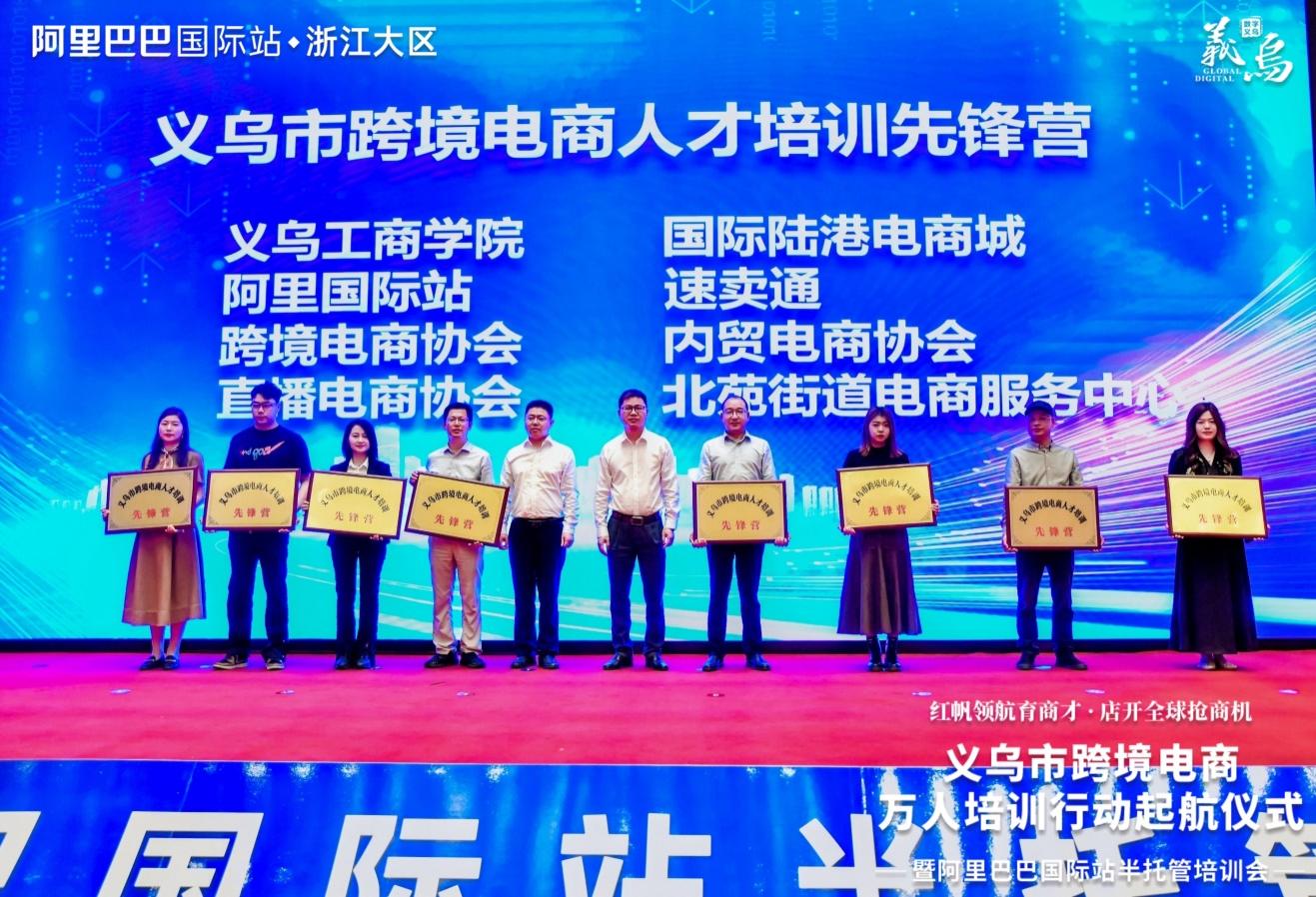 现场,义乌市相关负责人为义乌工商职业技术学院、义乌国际陆港电商城等8家“跨境电商人才培训先锋营”授牌,激励院校、国企、协会、平台、电商服务中心等机构共担电商人才培育重任,强化资源导入、培养衔接;义乌市场发展委、人力社保局、市场监管局、税务局、金融机构等单位组成“红帆领航店开全球”服务团,现场提供跨境电商企业注册、税务、金融等一站式服务。