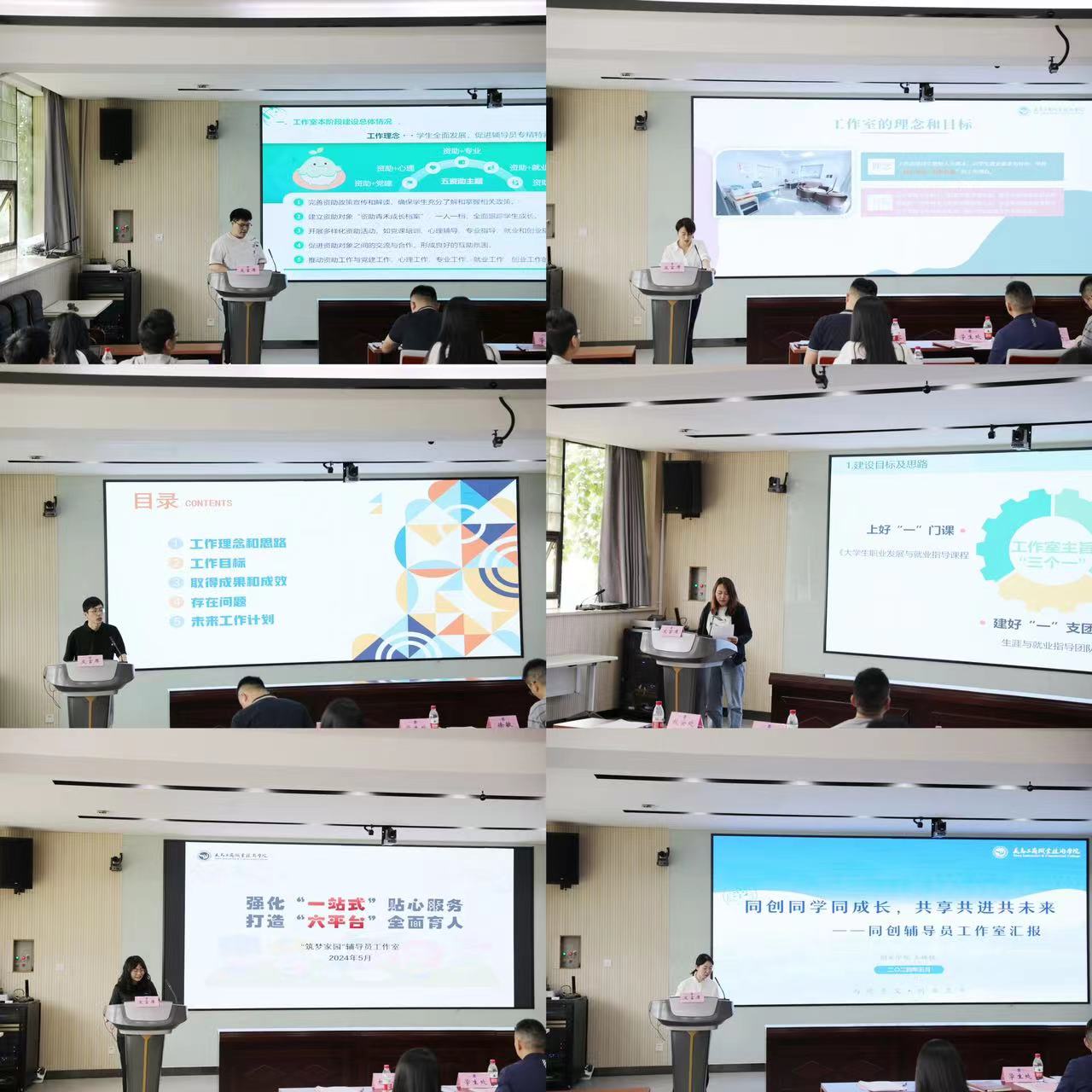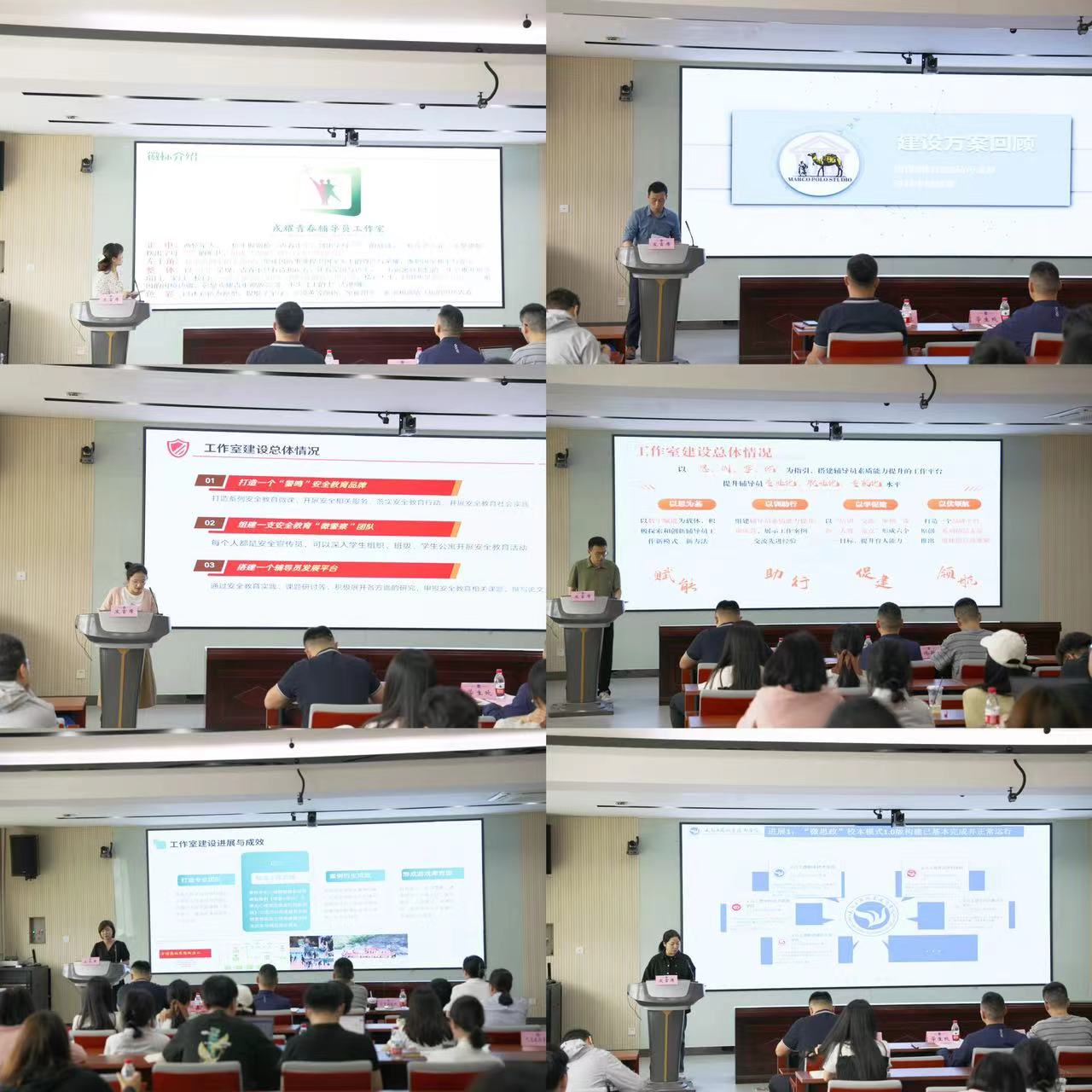 此次中期考核汇报会分为两个阶段。第一阶段,2023年立项的12个辅导员工作室负责人分别从工作室建设情况、建设载体、具体举措、取得成效、存在问题及下一步发展规划等方面进行汇报。第二阶段,徐敏老师以“辅导员工作室视域下高校劳动教育创新实践”为题,从工作室建立的初心、建设载体、队伍建设等方面出发,为辅导员深入浅出地解答了为什么要建辅导员工作室、建什么样的工作室以及如何处理专项工作和工作室工作的关系。