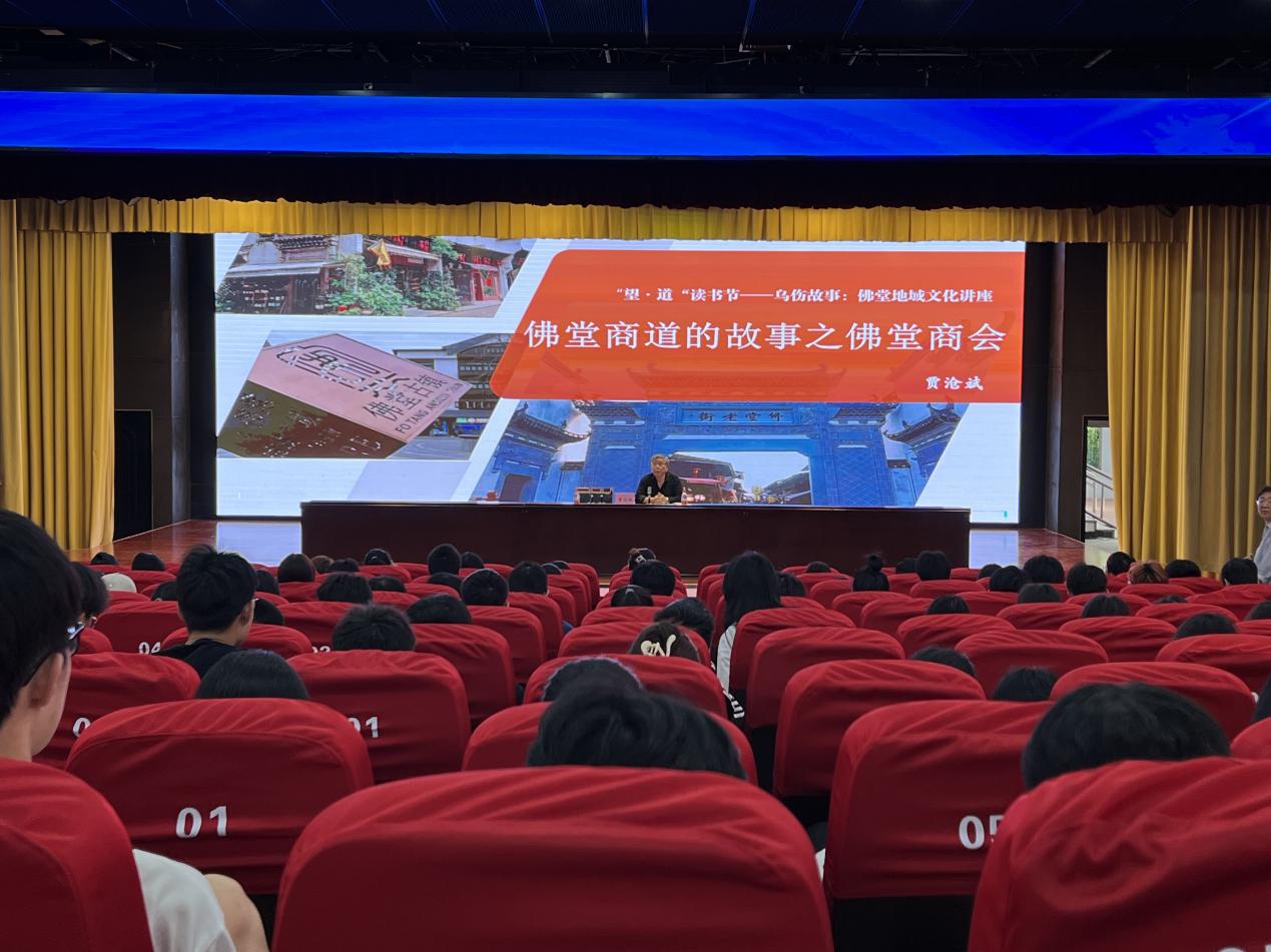 佛堂是义乌商贸文化名镇,贾沧斌先生则是土生土长的佛堂古镇历史文化研究专家,曾出版《千年佛堂》等多部研究著作,被誉为佛堂的“活字典”。在他对家乡故事饱含深情的娓娓道来中,在座师生不仅了解到佛堂古镇得名、发展及兴盛的千年历史脉络,以及佛堂商会产生、职能、发展嬗变及商会的“三禁公约”等丰富知识,还聆听了佛堂古镇抗战时期及红色党建的历史故事。师生们不仅领略到佛堂商道文化的风采,品味其中所蕴含的“勤耕好学、刚正勇为、诚信包容”的义乌精神,还重温义乌红色文化的珍贵历史片段,触摸了“义乌发展经验”的文化根脉。
