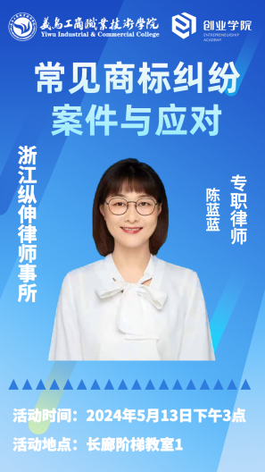 为进一步做好学生创新创业服务,为学生顺利创业保驾护航,5月13日下午,创业学院邀请了浙江纵伸律师事务所的专职律师陈蓝蓝开展了“常见商标纠纷案件与应对”指导活动。本次活动旨在通过深入分析商标纠纷案例,帮助学生增强商标保护意识,同时融入廉洁元素,强调职业道德、诚信经营和法律意识在创业过程中的重要性。